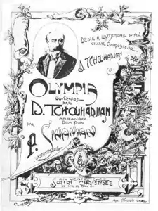 ![]() Перша сторінка фортепіанної транскрипції увертюри опери «Аршак II», виданої в Константинополі у 1900 році під назвою «Олімпія» | ||||