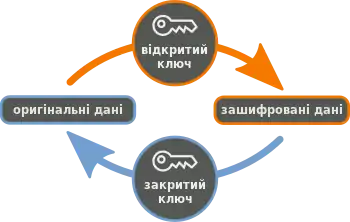 - закритий (private key) - використовується виключно для розшифровування повідомлень, що були закодовані відкритим ключем.