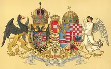 Австро-Угорщина, середній герб, новий дизайн 1915 р., кольорова версія 1917 р. З різними формами асоціації гербів: об'єднання двох національних гербів та одного герба родини на спільній основі; Центральні кріплення щита; різні поєднання територіальних гербів