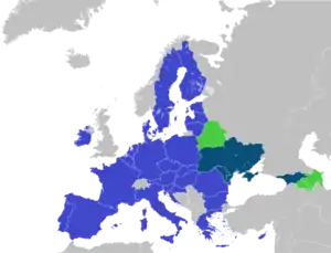 ![]() Учасниці Асоційованого тріо та Східного партнерства, що не є членами Європейського Союзу Європейський Союз Учасниці Східного партнерства, що не є членами ЄС та Асоційованого тріо | |