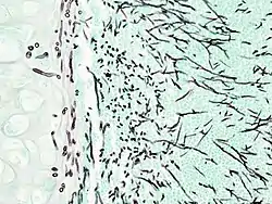 ![]() Гістопатологічне зображення легеневого інвазивного аспергільозу у пацієнта з інтерстиціальною пневмонією. Гоккотова метенамінна срібна пляма. Гістопатологічне зображення легеневого інвазивного аспергільозу у пацієнта з інтерстиціальною пневмонією. Гоккотова метенамінна срібна пляма. | |