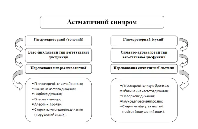 Гіпоергічний «вологий» астматичний синдром спостерігається на тлі переважання парасимпатичної системи, стрес-лімітуючих гормонів, алергічних реакцій і метаболічного зсуву в бік алкалозу. Гіперергічний «сухий» астматичний синдром, навпаки, виявляється при симпатотонії, переважанні стрес-індукційних гормонів, імунодефіциті і зміщення рН середовища в бік ацидозу.
