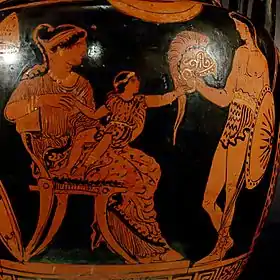 ![]() Гектор напередодні своєї загибелі разом з Андромахою, що тримає Астіанакта на колінах. Апулійська червонофігурна кераміка, 370—360 рр. до н. е., з колекції Національного музею палаца Джатта (Барі). | |