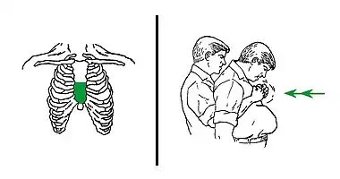 Якщо потерпілий не може кашляти, використовуйте[4] ці дві техніки вручну (дивіться обидві картинки нижче).