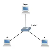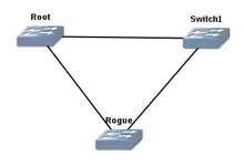Нехай спочатку в мережі було два комутатора: Root (кореневий) та Switch1. Потім зловмисник підключив контрольований ним комутатор Rogue, налаштований так, щоб стати кореневим вузлом дерева STP.