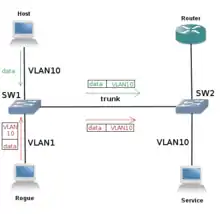 Розглянемо топологію, зображену на малюнку. Нехай native VLAN має номер 1 (за замовчуванням). Router виконує роль Router on a stick для всієї мережі, в тому числі розмежовує доступ одних VLAN до інших. Нехай VLAN10 може пересилати інформацію в будь-яку іншу VLAN, але зворотний потік заборонений. Нехай Host — легітимний користувач, а Rogue — зловмисник. Нехай атакуючий посилає кадр, маркований як той що належить VLAN10. Комутатор SW1, отримавши кадр з порту, належить native VLAN, не маркує його, а пересилає далі через trunk. Однак комутатор SW2 на іншому кінці, отримавши кадр, зауважує, що він маркований, з'ясовує, якому VLAN він належить, прибирає маркування і пересилає кадр далі під VLAN10. Як видно на малюнку, кадри зловмисника виглядають так само, як і кадри легітимного користувача для SW2. Таким чином, атакуючий зміг обійти обмеження, забезпечувані маршрутизатором Router, і переслати інформацію безпосередньо між різними VLAN.