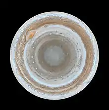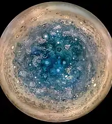 Атмосфе́ра Юпі́тера — газова оболонка, яка оточує Юпітер. Атмосфера Юпітера є найбільшою планетною атмосферою в Сонячній системі. Вона не має чіткої нижньої межі і плавно переходить в океан з рідкого водню[1]. Виділяють такі шари атмосфери (знизу вгору): тропосфера, стратосфера, термосфера й екзосфера. Кожен шар має свій характерний температурний градієнт[2]. Найнижчий шар, тропосфера, містить складну систему з хмар і туманів, включаючи шари аміаку, гідросульфіду амонію і води[3]. Верхні аміачні хмари, які спостерігаються на «поверхні» Юпітера, організовані в численні смуги, паралельні екватору, й обмежені сильними зональними атмосферними потоками (вітрами), відомими як «джети» чи «струмені». Смуги мають різне забарвлення: темніші смуги прийнято називати «поясами», а світлі — «зонами». Зони — це області висхідних потоків, мають меншу температуру, ніж пояси — області низхідних потоків[4]. Вважається, що своїм світлим забарвленням зони завдячують аміачному льоду, але точно невідомо, що надає поясам темніший відтінок[4]. Походження структури зі смуг і джетів також достеменно невідоме. Запропоновано дві моделі цієї структури. У поверхневій моделі вважається, що це поверхневі явища над стабільними внутрішніми областями. У глибинній моделі вважається, що смуги й джети — поверхневі прояви глибинної циркуляції, яка протікає в мантії Юпітера, що складається з молекулярного водню й організована у вигляді системи циліндрів[5].