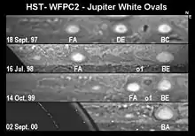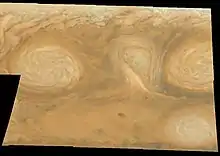 В атмосфері Юпітера відбуваються різноманітні активні явища, такі як нестабільність смуг, вихори (циклони та антициклони), бурі й блискавки[7]. Вихори виглядають як великі червоні, білі та коричневі плями (овали). Дві найбільші плями — Велика червона пляма (ВЧП)[8] і овал BA[9] — мають червонуватий відтінок. Ці дві плями та більшість інших великих плям є антициклонами. Маленькі антициклони зазвичай бувають білими. Вважається, що глибина вихорів не перевищує кількох сотень кілометрів. Розташована у південній півкулі ВЧП — найбільший з відомих в Сонячній системі вихорів. У межах цього вихору могло б розміститися декілька планет розміром як Земля, і він існує вже принаймні 350 років. Овал BA, який розташовується південніше ВЧП і втричі менший за останню, є червоною плямою, сформованою у 2000-му році злиттям трьох білих овалів[10].