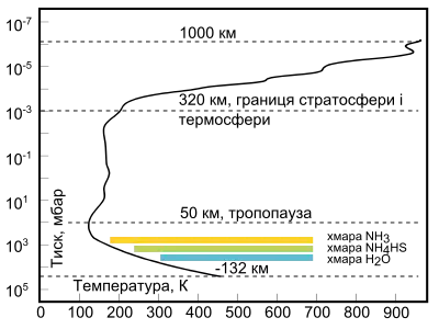 Вертикальні варіації температур в атмосфері Юпітера подібні до земних. Температура тропосфери зменшується з висотою, доки не досягає мінімуму, який називається тропопаузою[15]. Тропопауза є межею між тропосферою й стратосферою. На Юпітері тропопауза приблизно на 50 км вища від видимих хмар (або рівня 1 бар), де тиск і температура близькі до 0,1 бар і 110 К.[2][16] У стратосфері температура підвищується приблизно до 200 К при переході в термосферу і за висоти й тиску близько 320 км і 1 мікробар[2]. У термосфері температура продовжує зростати, досягаючи 1000 К приблизно на висоті 1000 км і за тиску 1 нанобар[17].