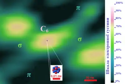 Загально відомим є факт, що отримати зображення електронної хмарки атома за допомогою фотонів неможливо через велику довжину хвилі світла. Отримати зображення електрона шляхом бомбардування його зовнішніми електронами теж неможливо. Це принципові фізичні заборони. Вирішити цю проблему вдалося О. П. Кучерову[3][4][5] , який, виходячи з фундаментальних основ квантової механіки, довів існування ефекту зсуву траєкторії зовнішніх електронів хмаркою атома. Сутність ефекту полягає в тому, що величина зсуву траєкторії електронів прямо пропорційна густині електронної хмарки, яка визначається як квадрат модуля хвильової функції. На фото наведено пряме зображення атома вуглецю[4], із схематичним зображенням ядра. Зображення отримане шляхом денситометрії електронної хмарки з роздільною здатністю 10 пікометрів. Атом вуглецю (C6) знаходиться в складі кристалічної решітки графіту і має вигляд, який повністю відповідає періодичному закону Д. І. Мендєлєєва. Внутрішня оболонка складається з двох електронів — рожеве коло. Чотири зовнішніх валентних електрона створюють чотири витягнутих хмарки. Перші дві хмарки створюють сильні σ-зв'язки з сусідніми атомами вуглецю. Це дві гібридизації sp² орбіталей (зелений колір). Другі дві хмарки створюють слабкі π-зв'язки з атомами верхнього та нижнього шарів графіту (блакитний колір). π-зв'язки мають вигляд циліндрів діаметром ~ 100 пм і довжиною ~ 200 пм. Також можна подивитись пряме зображення атомів в наступних речовинах: вуглецеві нанотрубки; руденіт; пентан; графіт. В роботі[5] наведено пряме зображення атомів кремнію та германію.