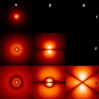 - Орбіталі визначаються специфічним розподілом ймовірності того, де саме можна знайти електрон. Приклади орбіталей та їхні позначення наведені на малюнку праворуч. «Межею» орбіталі вважається відстань, на якій імовірність того що електрон може перебувати поза нею, є меншою 90 %.