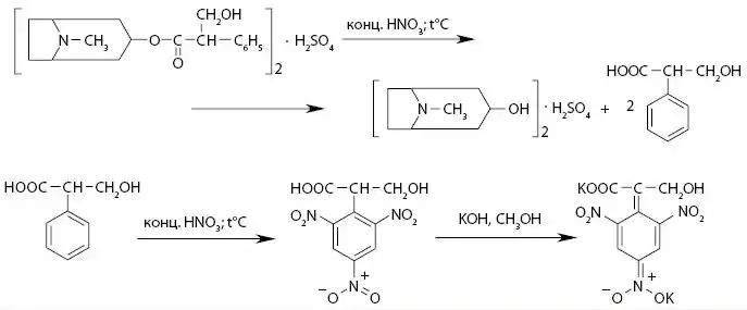 6. Утворення бензальдегіду (запах гіркого мигдалю) при нагріванні атропіну з сульфатною концентровною кислотою у присутності кисталика калій дихромату[4].