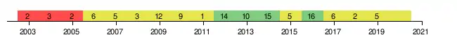 Зеленим кольором позначені виступи у вищому дивізіоні; жовтим — другому; червоним — третьому.