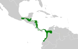 Вид поширений у Центральній Америці та на заході Колумбії та Еквадору. Його природне середовище проживання- субтропічний або тропічний вологий низинний ліс.