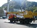 Автокран «Галичанин». Аутригери розташовані в середині і кінці машини і засунуті досередини. Їхні торці пофарбовані червоними і білими смугами