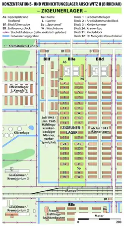 - Аушвіц ІІ (Біркенау), табір винищення. Став місцем знищення близько 1 млн євреїв, 75 000 поляків та 19 000 циган.
