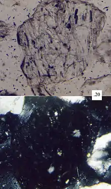 Зерно вулканічного піску, з дрібнозернистим матеріалом, як видно під петрографічним мікроскопом