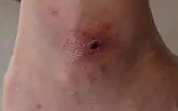 При трансмісивному механізмі передачі інфекції зараження відбувається через укус переносника — різних видів комах. У місці цього укусу при деяких хворобах з цієї групи відбувається місцеве запалення як результат первинного контакту зі збудником. Як правило на початку первинний афект являє собою досить видну пляму, що може зростати до діаметра в декілька сантиметрів. Потім розвивається інфільтрат. Поширення цього запалення далі дуже часто проявляється розвитком регіонарного лімфаденіту.