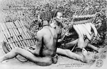 - Люди Гусі використовують величезну лютню під назвою обокано та наземний лук[41] зроблену копанням великої ями в землі, над якою прив'язують шкіру тварин. У шкірі врізається невеликий отвір і поперек отвору розміщується одна струна.