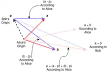 Подібним чином, Аліса і Боб можуть обчислити будь-яку лінійну комбінацію a і b або будь-якої скінченної множини векторів і зазвичай матимуть відмінні відповіді. Однак, якщо сума коефіцієнтів у лінійній комбінації 1, тоді Аліса і Боб отримають ту саму відповідь.