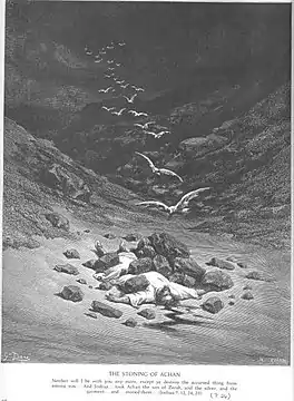 Наступна поразка євреїв у місті Ай, яке повинно було стати більш легкою здобиччю, аніж Єрихон, свідкувало про Божий гнів на Ісуса Навина [2]. За допомогою жеребу Ісус Навин визначив, хто з ізраїльтян винен у непослуху. Ахан зізнався, що сховав речі, які йому сподобались, а також золото та срібло з Єрихону у себе в наметі. Речі були віднесені у долину Ахор, що означає “нещастя” або “біда”, де Ахана, його сім'ю, худобу та намет каменували, а потім спалили [3]. У єврейському тексті Ахану дається ім'я Ахар (“біда”)[4], тому що він навів біду на Ізраїль захопивши те, що повинно було бути посвячене Господу.В агадичній літературі єврейські екзегети гадають, що каменована була лише худоба Ахана. Сини та доньки Ахана були лише свідками каменування для перестороги та повчання. Скоріш за все, такої точки зору притримувались і талмудисти, хоча вони і говорять, що дружина та діти також були причетні до цього злочину, так як вони знали про нього. Згідно з іншим, древнішим равіністичним переданням, злочин Ахана мав тяжчий характер: в Єрихоні Ахан побачив ідола, який мав магічну силу, з золотим язиком, на якого був накинутий дорогоцінний плащ, а перед ним лежало дуже багато срібла. Захопивши цього ідола та срібло, Ахан став причиною смерті 36 воїнів, які обслуговували ковчег Завіту. Коли Ісус Навин дізнався завдяки 12-ти дорогоцінним каменям, які були вставлені у нагрудник первосвященика, хто винуватець, то звелів покарати його каменуванням та вогнем згідно з Законом [5].