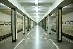 Оздоблення лаконічне й просте: колони, оздоблені білим мармуром і коричневим гранітом, немов квадратні мінарети, тримають стелю станції. Підлога станції викладений сірим гранітом, по якому витягнулися дві смуги з білого мармуру, що перетинаючись під прямим кутом утворюють у просторі між собою — прямокутники. Оздоблення колійних стін іде не до стелі, а до рівня трохи вище поїзда. Дві смуги з коричневого граніту на колійній стіні облицьованої світлим мармуром повторюють узор розташований на підлозі станції. Варто зауважити, що оформлення станції подібними смугами дуже гармонує з типовим «смугастим» забарвленням метровагонів.