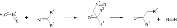 Також взаємодіє з діазометаном. При цьому до ацетону приєднується CH2, та утворюється метилетилкетон. Спочатку діазометан приєднується до молекули, атом оксигену набуває негативного заряду, атом нітрогену — позитивного. Потім азот відщеплюється, і одна з метильних груп периєднується до CH2: