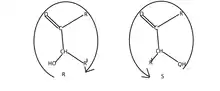 Для ацилоїнів характерна оптична ізомерія через наявність хірального атома карбону. Її позначають R,S-номенклатурою. Якщо подиитися з протилежного від атома гідрогену боку, і послідовність OH—CO-R—R`, тобто спадання старшинства замісників, буде йди за годинниковою стрілкою — це R-ізомер, якщо проти — S.
