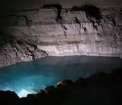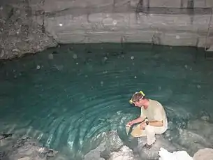 На дні озера в печері були виявлені каррові гребінці, походження яких пов'язане з потоками води, що витікає з озера[21]. Згідно з аналізом, у глибинних шарах озера температура води коливається від 28,5 до 30 °C, вміст сірководню — 4,5 ‰, рн — 6,8, солоність — від 490 до 1300 мг/л хлориду[35]. Нижче глибини 1 м вода в озері безкиснева[22]. Шар сірчистої термальної води накладається на теплу поверхневу воду з температурою близько 25 °C, її властивості точно відповідають навколишній ґрунтовій воді, і саме в ній мешкають ракоподібні з печерної фауни[36].