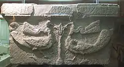 Найближчою аналогією цього сюжету є зображення на кам'яній капітелі, виявленої 1948 року на території християнського храму VI—VII ст. у Судагилані, біля Мінгечаура (табл. 28). На одній зі сторін цієї чотирикутної у плані капітелі висічені два павичі зустрічно по боки стилізованого дерева: потовщений донизу стовбур закінчується вгорі трипелюстковою пальметою, що нагадує за своїми контурами квітку. Павичі тут також прикрашені царственими стрічками і наводять на пам'ять подібну композицію (два павича зі стрічками по боки вівтарика) на срібній подовженій чаші Державного історичного музею в Москві, виявленої 1947 р. у селі Бартим Пермської області. Карнизом капітелі тягнеться, огинаючи її з усіх чотирьох сторін, албанський напис.