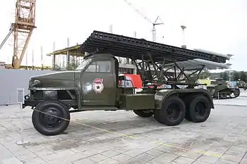 ![]() БМ-13Н на шасі Studebaker US6 (з опущеними бронеплитами захисту від вихлопу) в Центральному музеї Великої Вітчизняної війни у Москві | |