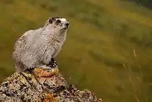 ![]() | Marmota caligata | Безлісні альпійські луки, де є скелясті відслонення — пд. Аляска, зх. Канада, штати Вашингтон, Айдахо, Монтана | Дієта складається майже повністю з трав'янистих рослин. Зимова сплячка: жовтень-лютий на півдні, вересень-квітень у Британській Колумбії. Це високосоціальні тварини. Живуть колоніями. |