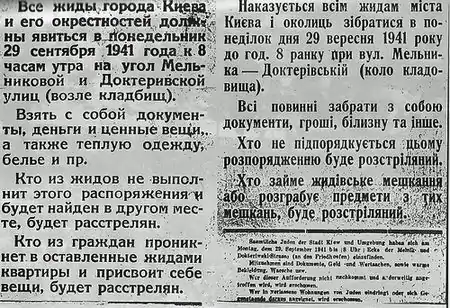 27—28 вересня на стінах будинків, огорожах і стовпах з'явилися оголошення з текстом українською, російською і німецькою мовами: «Всі євреї міста Києва і його околиць повинні з'явитися в понеділок 29 вересня 1941 року до 8 години ранку на ріг Мельникової і Дегтярівської вулиць (біля кладовища). Взяти з собою документи, гроші, цінні речі, а також теплий одяг, білизну тощо. Хто з євреїв не виконає цього розпорядження і буде знайдений в іншому місці, буде розстріляний. Хто з громадян проникне в залишені квартири і привласнить собі речі, буде розстріляний». Маса людей, які рухалися з різних районів міста, зливалася в один потік на вул. Мельникова. У кінці її, біля протитанкового рову, загородженого «їжаками», була поставлена «застава», за якою розгорнута похідна канцелярія. Почергово від натовпу відділяли 30—40 осіб і під конвоєм вели «реєструватися». У людей відбирали всі документи та цінності. Документи в поспіху кидали в мішки, а то і просто на землю, де вони лежали товстим шаром. Потім євреїв примушували роздягатися і через проходи в насипі виводили до краю яру, на протилежному боці якого на спеціально обладнаній дерев'яній платформі сидів кулеметник. Під безжалісний вогонь кулемета поліцаї заганяли палицями розгублених, голих, абсолютно знетямлених людей, не даючи їм схаменутися, зорієнтуватися. Розпачливе ридання, крики поліцаїв, благання про допомогу, прокляття катам, молитви, що заглушувалися веселими мелодіями вальсів з гучномовців, гуркотом літака, що кружляв над яром…