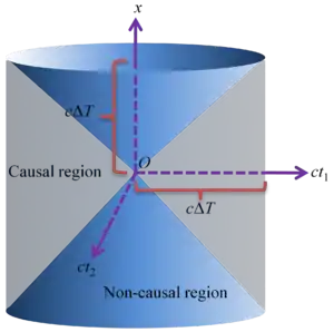 Для простоти розглянемо тільки одну просторову розмірність x3 і дві часові розмірності x1 і x2 (тобто, x1 = ct1, x2 = ct2, x3 = x). Припустимо, що в точці O, яка має координати x1 = 0, x2 = 0, x3 = 0, відбулася подія E. Припустимо далі, що з моменту події E пройшов інтервал часу. Причинно-наслідкова ділянка, пов'язана з подією E, включає себе бічну поверхню прямого кругового конуса {(x1)2 + (x2)2 − (x3)2 = 0}, бічну поверхню прямого кругового циліндра {(x1)2 + (x2)2 = c2 ∆ T2} і внутрішню ділянку, обмежену цими поверхнями, тобто причинно-наслідкова ділянка включає всі точки (x1, x2, x3), для яких виконуються умови[2]: