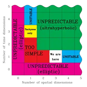 Тільки в світі з одновимірним часом можна надійно розрахувати стан фізичних систем у майбутньому (у світі без часу такі розрахунки неможливі, а в світі з багатовимірним часом розрахунок майбутнього стану фізичних систем дає кілька варіантів розв'язку). Єдиний варіант одного розв'язку для фізичних рівнянь у світі з багатовимірним часом — це рух спостерігача зі швидкістю світла, коли час для нього взагалі не існує. Тільки світ з тривимірним простором дає достатню стабільність і складність, оскільки в світі з числом вимірів простору менше 3 малоймовірна гравітація і виникають топологічні проблеми, а в світі з числом вимірів простору більше 3 неможливе існування стабільних орбіт (для гравітаційного та електромагнітного полів або інших далекодійних взаємодій). Тому світи з розмірністю часу відмінною від 1 мають нестачу прогнозованості, а світи з розгорнутою розмірністю простору більше 3 — брак стабільності. Таким чином, дотримання антропного принципу виключає будь-які варіанти світу крім N = 3 і Т = 1 (або N = 1 і Т = 3 в інших концепціях)[6].
