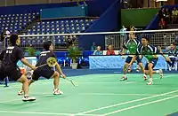 Бадмінто́н — спортивна гра, яка проводиться на невеликому майданчику, поділеному сіткою на 2 рівні частини. На них розташовуються супротивники, які за допомогою ракетки намагаються перекинути волан (коркова або пластмасова півсфера з пір'яним або нейлоновим обрамленням) через сітку на іншу половину корту так, щоб супротивник не зміг відбити його назад. Бадмінтон - олімпійський вид спорту.