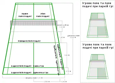 1.1. Корт повинен бути прямокутним і поділений на поля лініями шириною 40 мм, як це показано на рисунку.