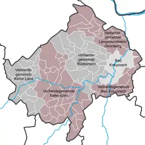 Район складається з 116 міст і громад (нім. Gemeinden), об'єднаних в 8 об'єднань громад (нім. Verbandsgemeinden), а також двох міст, що не входять до складу об'єднань громад.