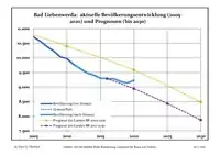 Динаміка населення з 1875 року в сучасних кордонах (Синя лінія: населення; Пунктир: відносна порівняльна динаміка населення землі Бранденбург; Сірий фон: період Третього рейху; Помаранчевий фон: період НДР)