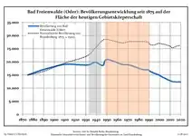 Динаміка населення з 1875 року в сучасних кордонах (Синя лінія: населення; Пунктир: відносна порівняльна динаміка населення землі Бранденбург; Сірий фон: період Третього рейху; Помаранчевий фон: період НДР)