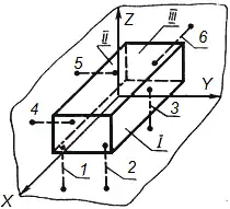 1-6 — двосторонні в'язі; I, II, III — бази деталі