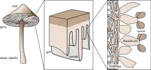 Схематичне зображення типової базидіокарпи, де показано плодове тіло, гименій і базідій