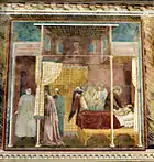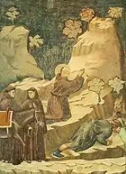 У поселенні Монте Марано поблизу Беневенто померла жінка з числа тих, хто був особливо відданий святому Франциску. Увечері приїхало кілька священнослужителів, щоб відслужити службу над покійною, і тут жінка раптово сіла в ліжку і покликала того з них, хто припадав їй дядьком. «Я хочу сповідатися, отче», — сказала вона, «Послухайте про мій гріх. Я була мертва і опинилася у страшній в'язниці, бо я ніколи не зізнавався у гріху, про який хочу розповісти вам. Але святий Франциск помолився за мене, бо я завжди служила йому віддано, поки була жива, і мені було дозволено повернутися у моє земне тіло. Після сповіді я зможу насолодитися вічним життям. Ви побачите, коли я отримаю віддяку». Потім вона сповідалася переляканому священикові, отримала відпущення гріхів, лягла в ліжко і спокійно спочила.[24] | Майстер св. Цецилії | |