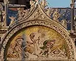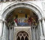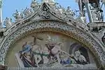 | Найстарша з мозаїк фасаду (XIII століття), зображує подію набуття мощей апостола після закінчення будівництва сучасної базиліки. У ході тривалого будівництва церкви мощі були заховані дожем і настоятелем собору, щоб уникнути їхнього викрадення. Схованка була загублена, а потім дивом була відкрита в пілястрі базиліки. | Мозаїка Леопольда даль Поццо по картону художника Себастьяна Річчі, 1728—1729 роки. | Найбільш пізня з мозаїк собору, виконана у 1836—1838 роках Ліборіо Саландрі по картону художника Латтанціо Кверено. | Невідомий мозаїст по картону художника П'єтро Веккіа, 1660 рік. | Невідомий мозаїст по картону художника П'єтро Веккіа, 1660 рік. Зображений огляд сарацинами корабля венеційських купців в Александрії, для запобігання виявлення мощей венеційці поклали їх у кошики і закрили свинячими тушами. |