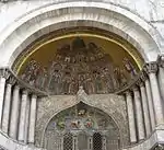 Між арками вхідних порталів, під розташованою вище лоджією, встановлені візантійські плити з парними барельєфами, які розташовані симетрично по відношенню до головного порталу. Цикл починається з зображень двох святих воїнів — Димитрія Солунського і Георгія Змієборця. Далі йдуть зображення Богородиці й архангела Гавриїла в сцені Благовіщення. Замикають цикл два зображення подвигів Геракла: приборкання Еріманфского вепра (плита візантійського походження епохи Феодосія) і вбивство Лернейської гідри (плита венеційської роботи, XIII століття).