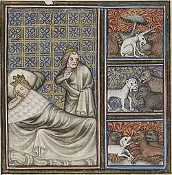 За легендою, Базіна в першу шлюбну ніч відхилила обійми Хільдеріка, прогнала його до дверей королівського замку та попросила подивитися у двір, а потім розповісти їй про побачене, а сама пішла до спальні. Хільдерік виконав її прохання і побачив перед воротами великих диких тварин: леопардів, левів та єдинорогів. Вражений, він поспішив до дружини та розповів їй про побачене. Вона сказала йому не турбуватися і попросила подивитися ще раз. Цього разу король побачив ведмедів та вовків, про що також розповів королеві, яка знову відправила його до дверей замку. Третього разу Хільдерік побачив собак та дрібних тварин (шакалів та стерв'ятників), які кидалися один на одного. Вражений, він знову піднявся у спальню до Базіни, і зажадав, щоб вона розтлумачила йому всі ці чудеса. Базіна сказала королю, що для цього треба провести цнотливу ніч, а на світанку вона йому пояснить побачене, але спочатку повинна буде все вивчити. Після сходу сонця, вона сказала йому: « Все, що ти побачив, говорить про майбутнє, про наших нащадків. Наш перший син буде потужним та сильним, як лев і єдиноріг, його діти та їхні нащадки будуть сміливими, як хижі вовки та ведмеді, а ось останні нащадки нашого роду будуть схожими на боягузливих собак. А дрібні тварини, яких ти бачив, це погані люди, які спробують вкрасти у них владу і, як шакали та стерв'ятники, будуть жадібно боротися за престол, а тому будуть нещасні ». Хільдерік був задоволений звісткою про велике потомство, яке матиме його коріння.