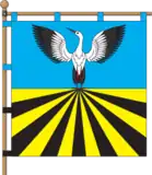 Квадратне полотнище поділене горизонтально на дві рівновеликі смуги – синю і жовту. На першій частині стоїть білий лелека з червоними дзьобом та лапами, чорними хвостом та розпростертими крилами. На другій частині від країв Прапора до центру сходяться в перспективу сім чорних і всім жовтих смуг.