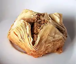 Баклава — багатошаровий десерт, який роблять з листків тіста товщиною з папір, які промащуються маслом або олією і викладаються шарами в прямокутний посуд для випічки або скручуються в циліндрики. Мелені і дрібно порубані волоські горіхи або фісташки викладаються між шарами тіста, які до цього випікаються і просочуються розчином цукру і соку лимона зі спеціями та трояндовою водою. Як і з будь-якою їжею, існують регіональні варіанти в рецептурі.