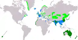 Зустрічається у Північній Америці, Гренландії, Європі (переважно Центральній та на Балканах, Лапландії), Північній Африці, Південній Азії (насамперед у Казахстані) і навіть в Австралії та Новій Зеландії. Гніздиться у Середній Азії та країн Середземномор'я.З початку 1980-х років чисельність гніздових популяцій виду збільшилася майже в усіх країнах Європи, що призвело до його інтенсивної територіальної експансії. В Україні гніздиться майже на всій території. В континентальній частині гніздування приурочене до великих водойм з достатньою кормовою базою, та риборозплідних ставків. Під час міграцій трапляється на більшій частині суходолу; зимує біля морського узбережжя, в пониззях Дніпра, Дунаю та Дністра.[2]