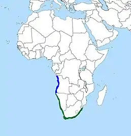 Вид поширений вздовж узбережжя Південної Африки. Птах гніздиться від південної Анголи до Східно-Капської провінції. У позашлюбний період трапляється північніше — до міста Лобіто в Анголі та до півдня Мозамбіку. За оцінками, чисельність виду сягає 234 тис. птахів.